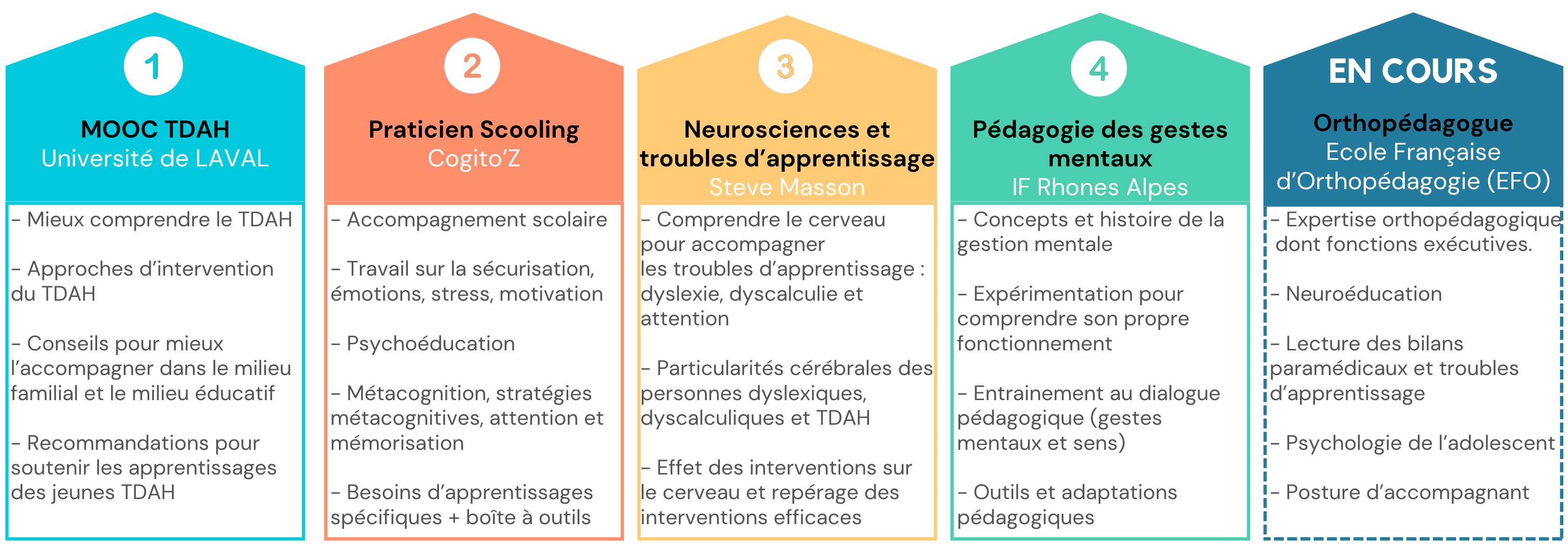 Ingénieure informaticienne de formation (INSA Lyon, 2006), j’ai eu à cœur de me former dans le domaine des apprentissages en sélectionnant des formations proches de ma vision et de mon expérience de terrain. Je suis également toujours investie dans l’association Avenir Dysphasie Rhône depuis 2018 (membre du bureau et du CA, conseils et animation des cafés des parents, organisation des activités de loisirs pour les enfants).