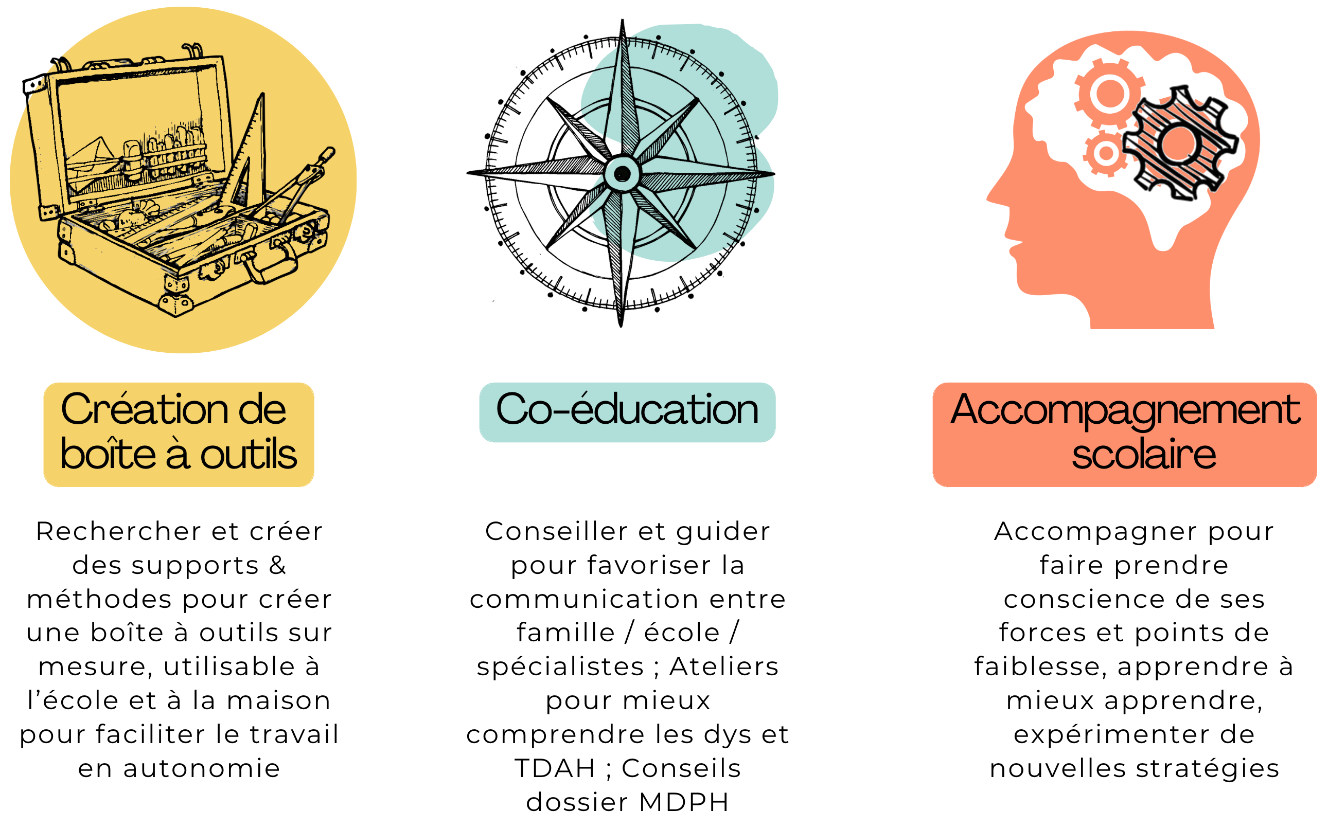 Je suis également formée spécifiquement pour accompagner les Troubles Neurodéveloppementaux comme les Dys et le TDAH.